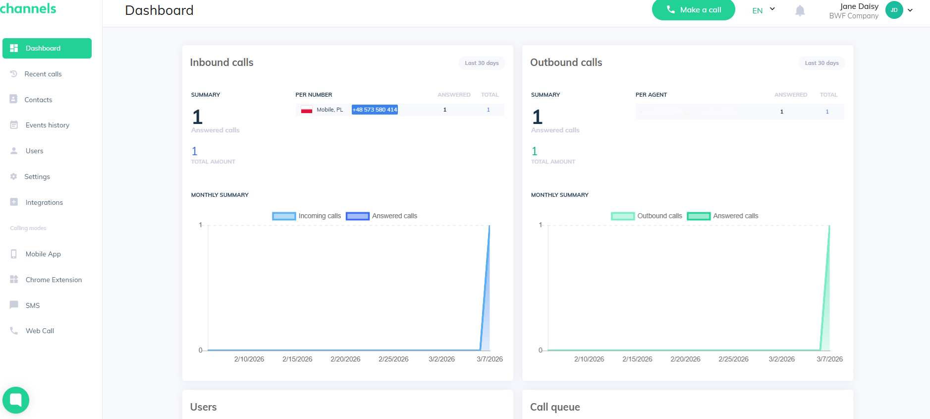 Inbound calls - Shows inbound call stats for the last 30 days. You can see the total number of inbound calls for each phone number in Channels and how many were answered.