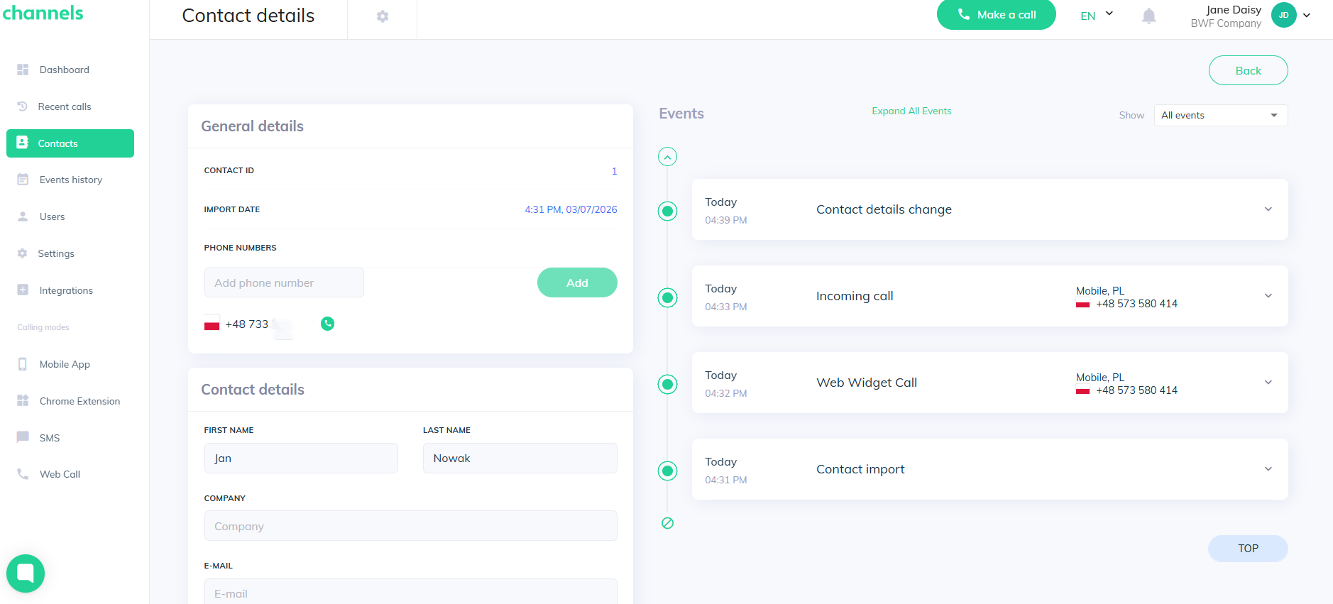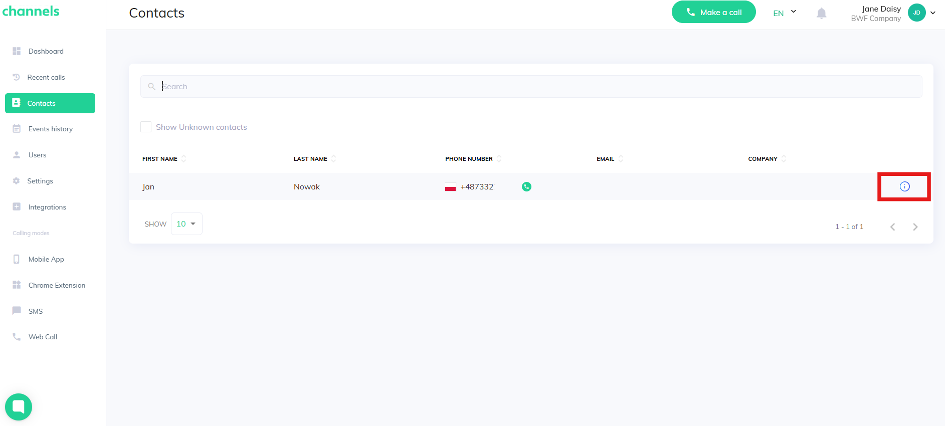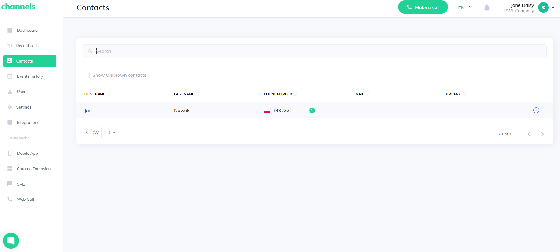 Managing contacts in Channels is simple. Open the manager panel and click the "Contacts" tab to see the Contacts list. There you can view all calls made on your account and any contacts added from your integrated apps (if any were added).