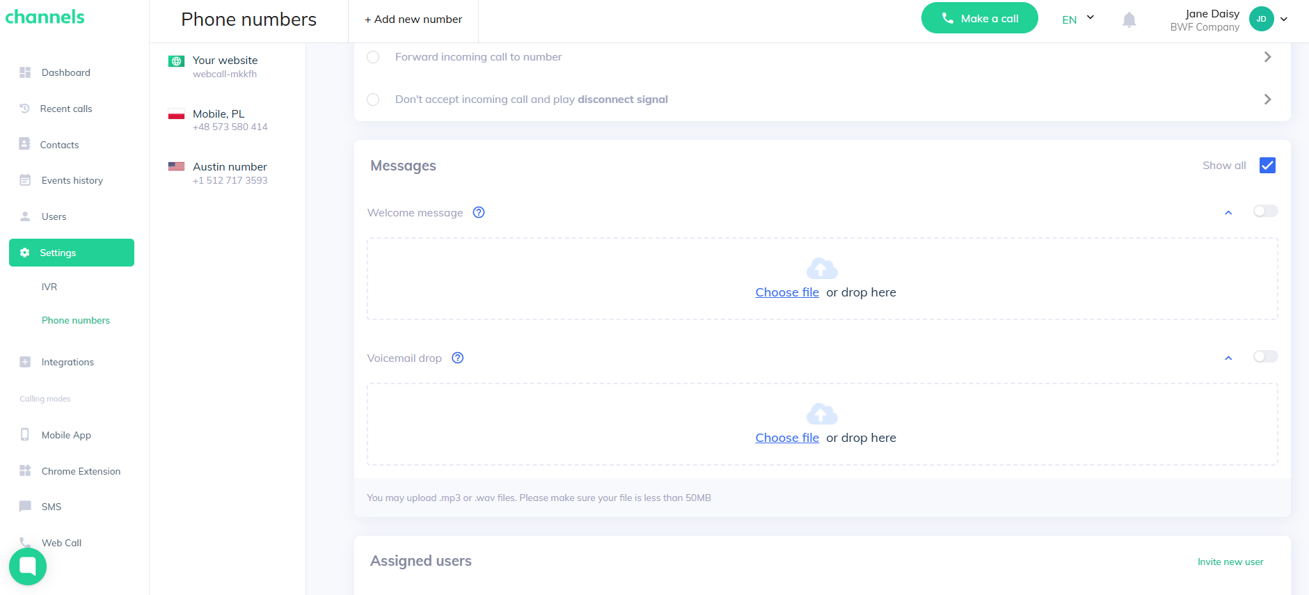 In the Messages section, you can upload pre-recorded messages to make communication clearer and faster. Use them to welcome customers, handle voicemails or answering machines, and tell callers when they are on hold.