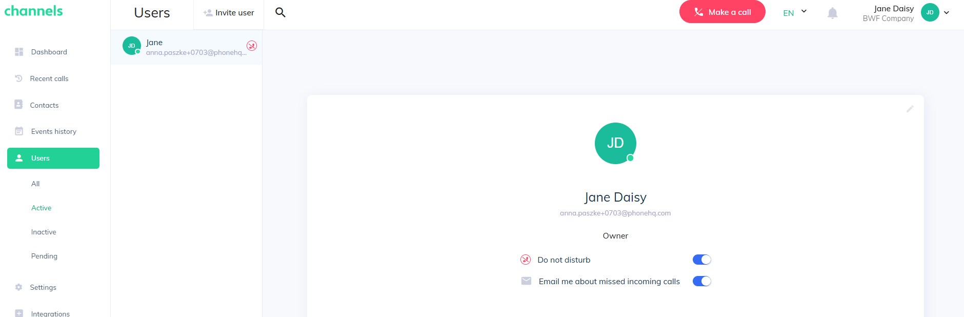 Owners can change each user’s inbound call settings from the user menu after selecting that user. They can also toggle inbound answering from the dashboard by clicking the icon next to the agent’s status.