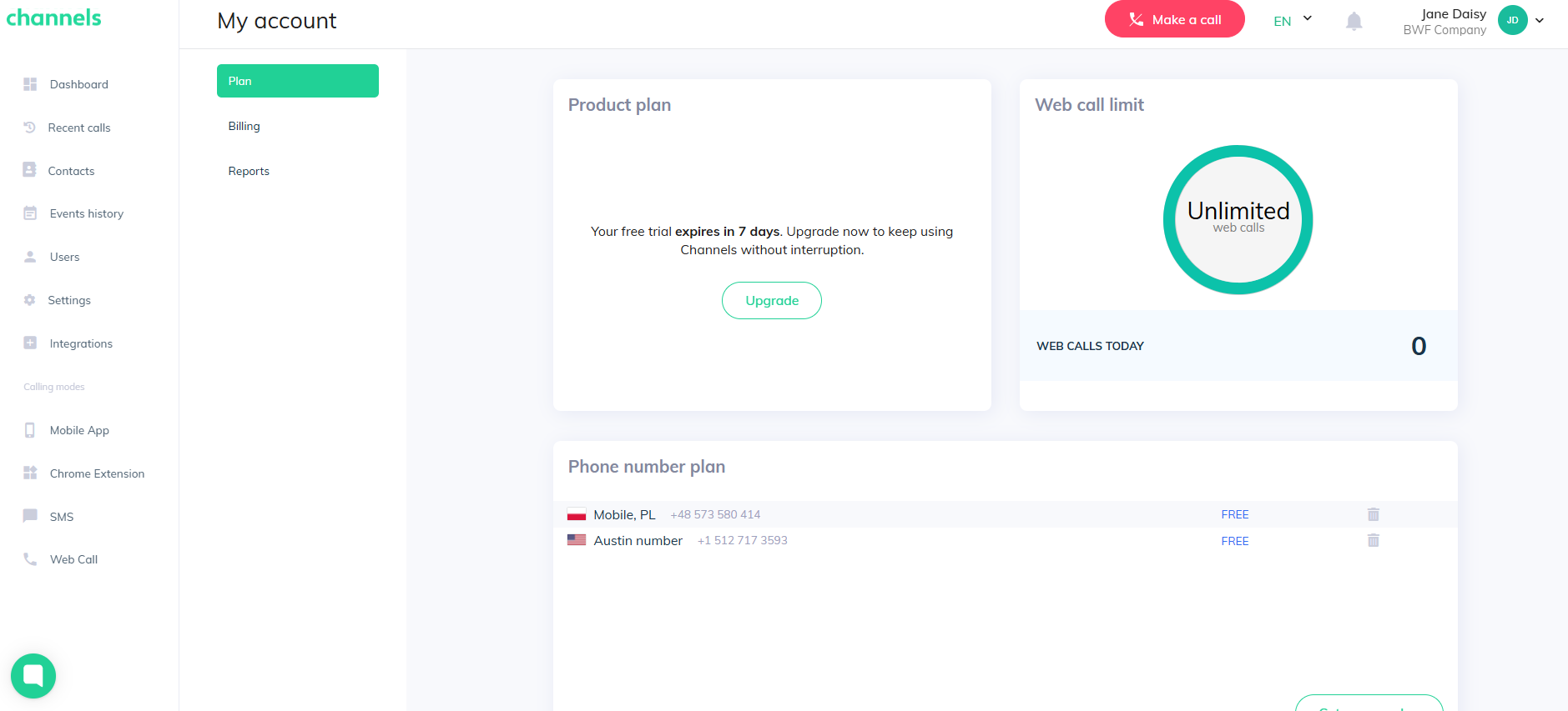 This section shows all phone numbers on your account. For paid numbers, you’ll see the monthly price and can detach them from your account. Free phone numbers cannot be detached.