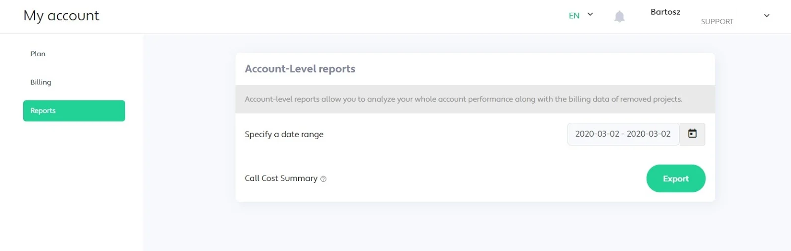 Call cost summary report allows you to see all costs and how you were billed per call at the time of generating the report. To generate this data please head to the Reports subsection of “My Account”.
