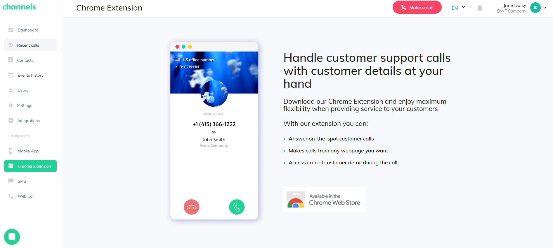 Channels browser extension installed and connected to your account, you can use it right away to make and receive calls in one place.